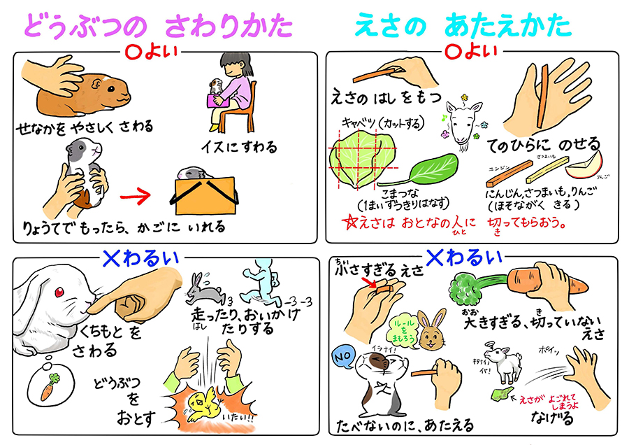 かわいいアニマルたちとのお約束。ふれあい方のルールをやさしく解説しています